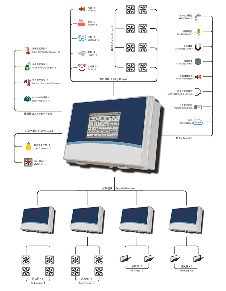 PH-TOUCH 是我公司推出的新一代禽舍環(huán)境控制器,采用7寸觸控顯示屏,最多到16組風(fēng)機(jī)組,24級通風(fēng)級別,多達(dá)31組繼電器輸出,模塊化的設(shè)計(jì),滿足不同用戶的需求。